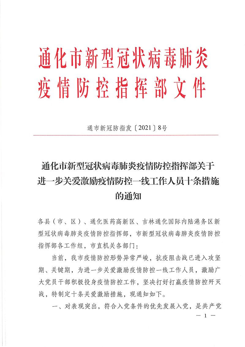 通化市新型冠狀病毒肺炎疫情防控指揮部關于進一步關愛激勵疫情防控一線工作人員十條措施的通知
